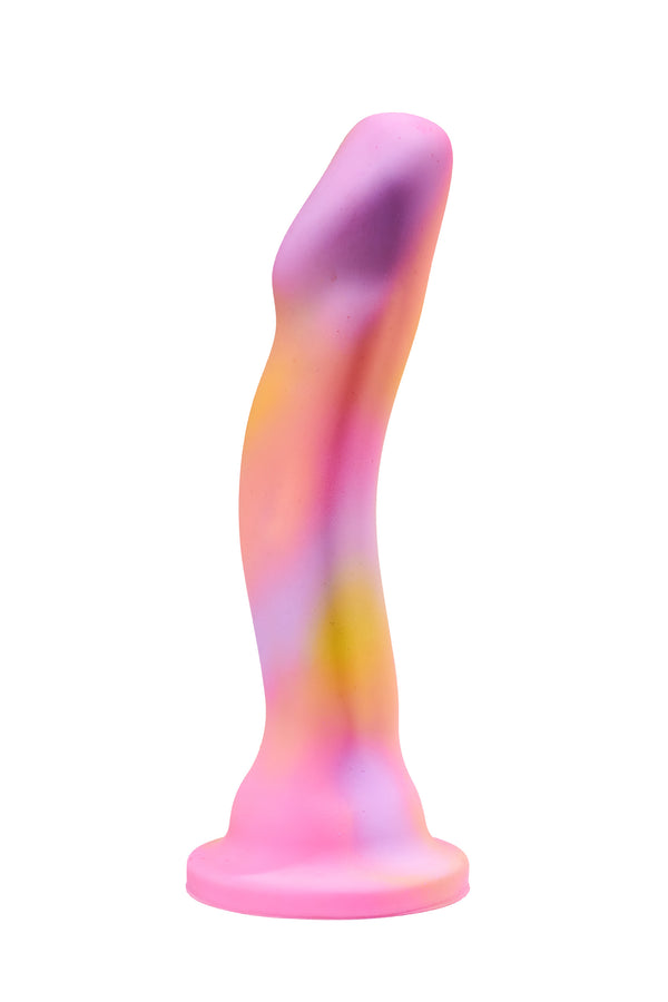 The Avant Chasing Sunsets dildo offers a unique handcrafted design with a brightly-colored gradient effect and subtle glitter sparkle. Its strong suction cup base allows for a hands-free experience, while the silky smooth UltraSilk™ and Puria™ silicone ensure a body-safe and pleasurable playtime.