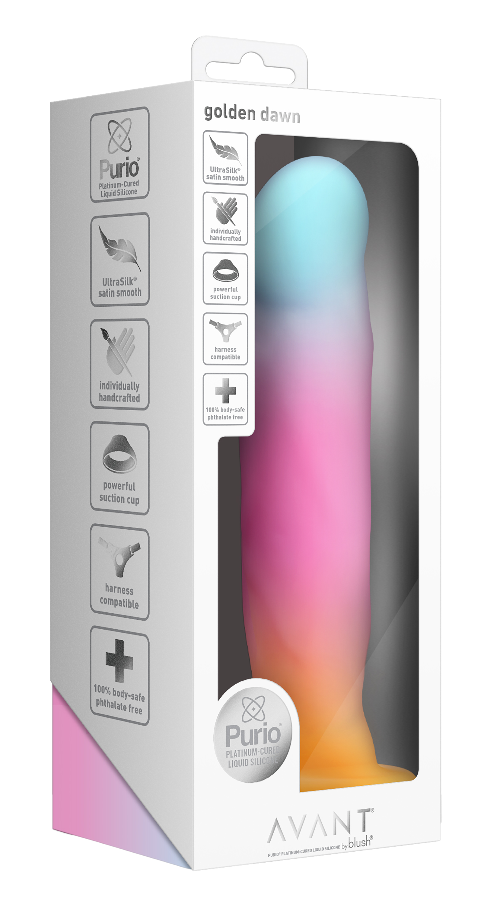 Avant Golden Dawn is a handcrafted 8-inch dildo featuring a broad head and soft ridges designed for G-spot and P-spot stimulation. Made from premium Purio® platinum-cured silicone with an UltraSilk® satin finish, it offers a luxurious, body-safe feel. The curved shaft provides deeper pleasure, while the suction cup base enables hands-free play and harness compatibility. Waterproof and easy to clean.