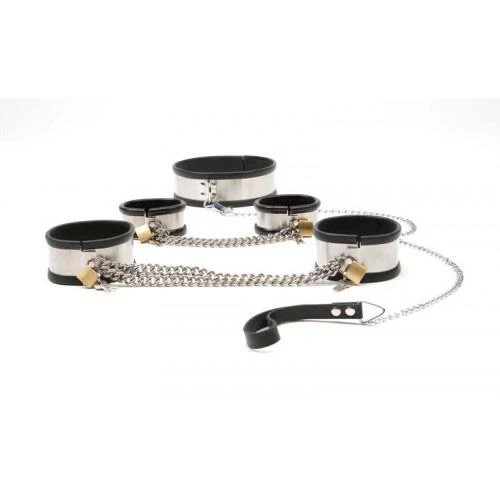Packing List: 1 x Collar with Lead Chain, 1 x Ball Gag, 1 x Pair of Handcuffs, 1 x Pair of Ankle Cuffs, 1 x Whip, 1 x Fabric Bag