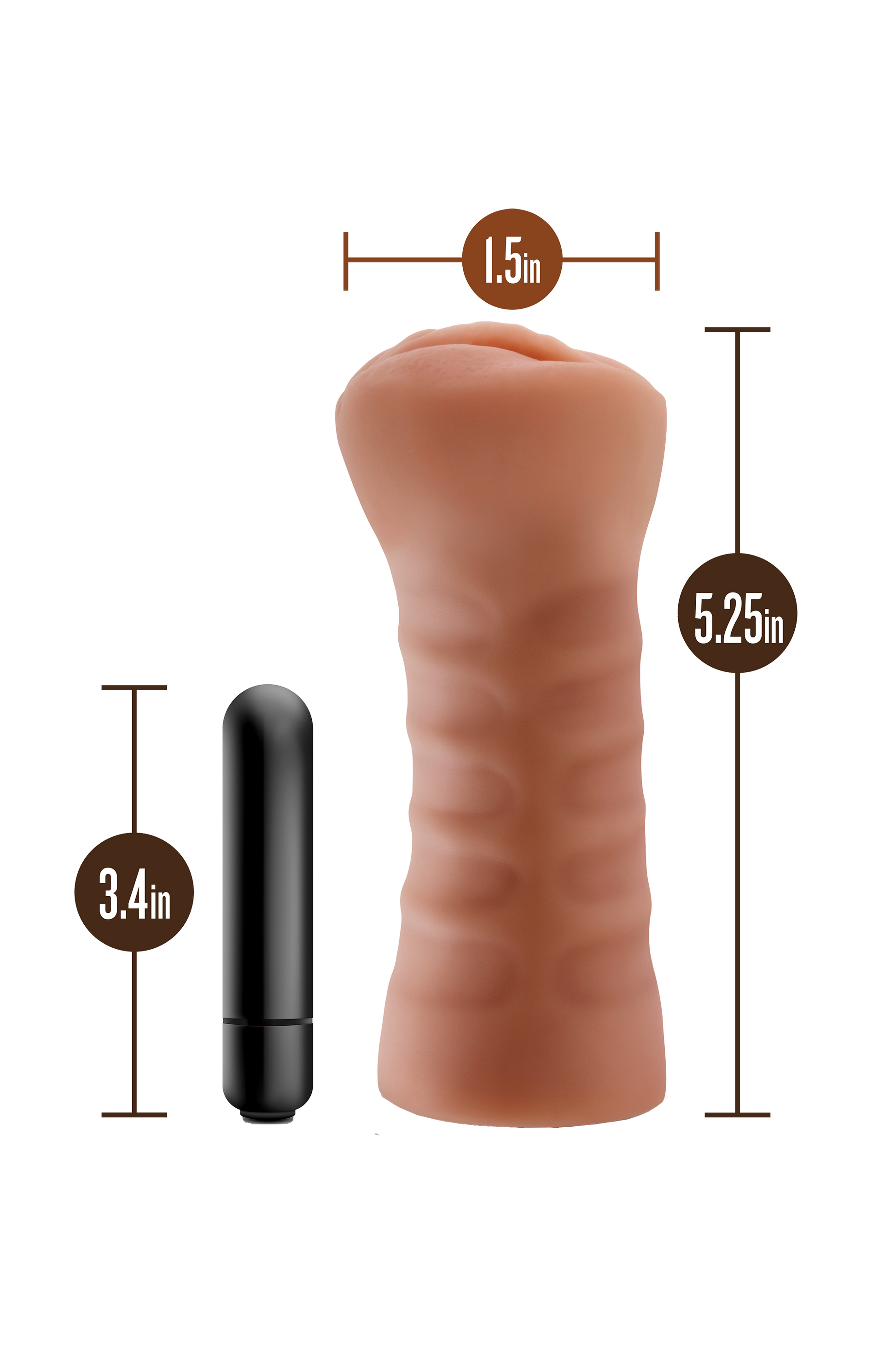 The M for Men Sofia is soft, open, and ready to play. This realistic stroker's canal is filled with sensational textures. It comes with a vibrating bullet, to enhance sensation as you stroke. Open-ended and easy to clean, Sofia will accommodate any size penis. Made of premium TPE, it's high-quality and body safe. Bullet vibe requires 1 AAA battery (not included).