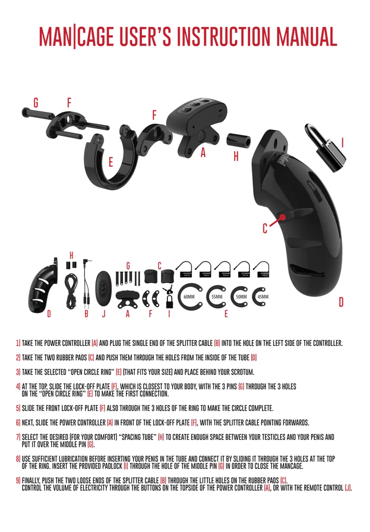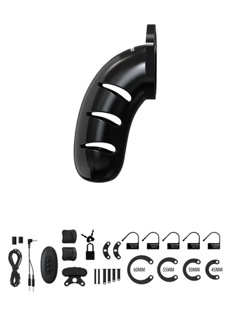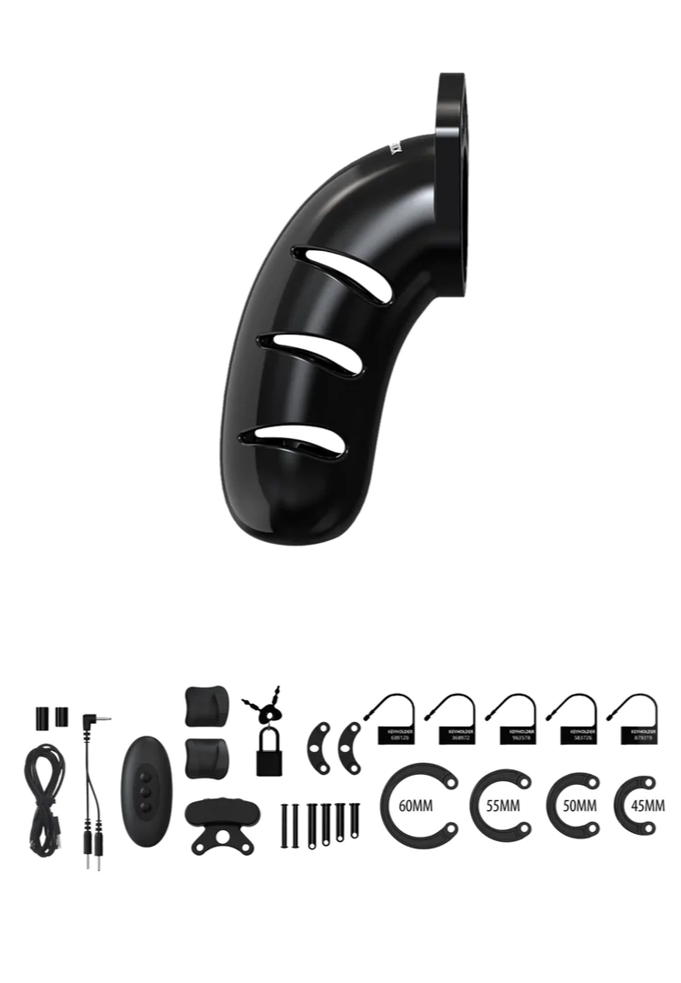 Kit includes cage (4.5" length), four different sized base rings (inner diameters of 1.77", 1.97", 2.17", and 2.36"), connector pin unit, connector pins, spacers, a metal padlock, and 5 plastic tie-wrap locks. Charger, e-stim leads and control.
