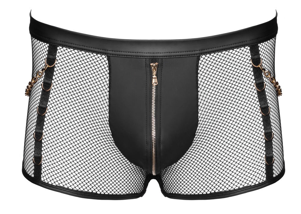 Svenjoyment's mesh and chain pants blend sheer net with sleek wetlook material for a bold, contemporary look. The opaque pouch zip ensures comfort and practicality, while soft, stretchy fabric moves with you. Gold-toned rings accent the sides and back waistband, paired with removable snap hook chains for customizable styling. Make a statement with confidence.